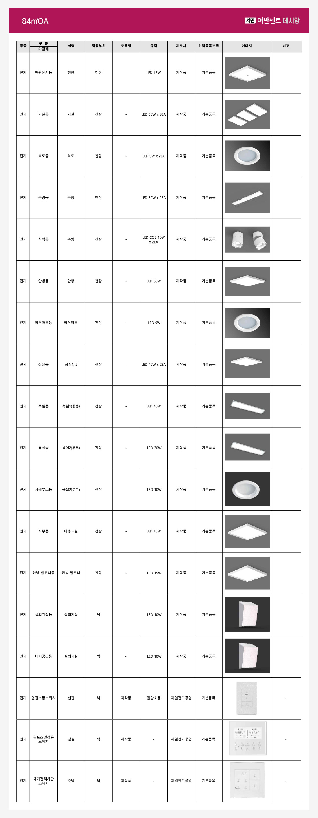 본 마감재 리스트는 인·허가 과정이나 실제 시공 시 변경될 수 있습니다.