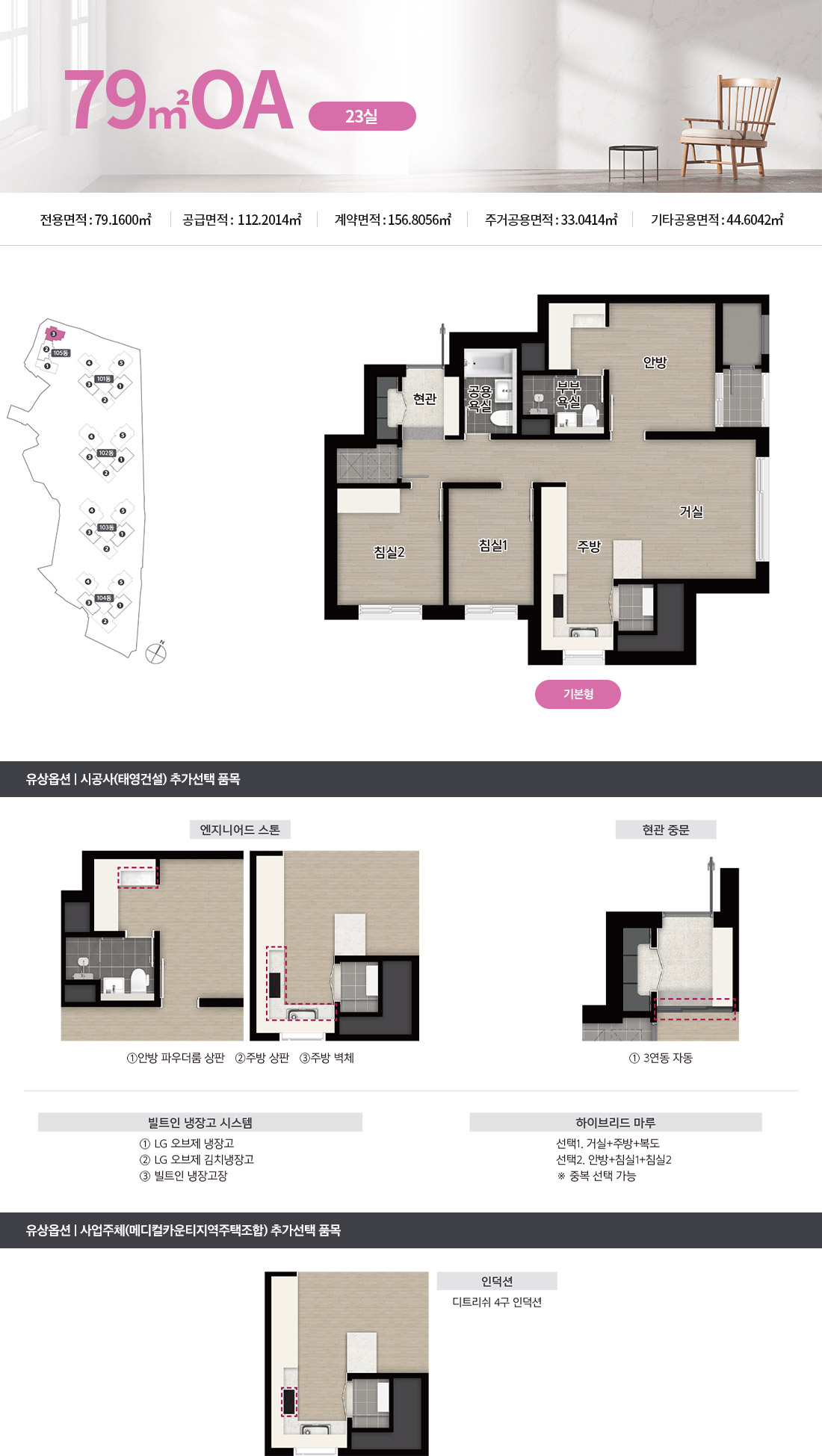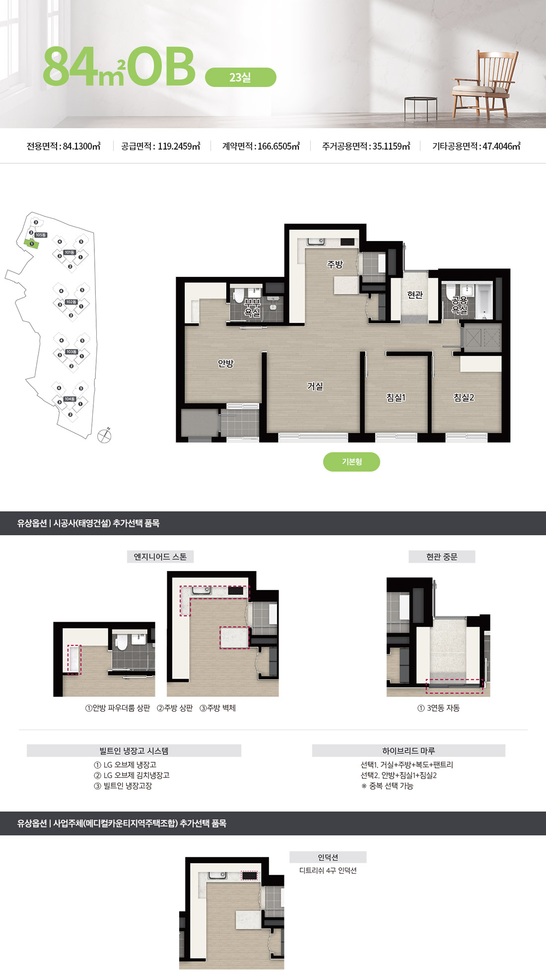 본 홈페이지 상의 옵션 사항은 각 세대(타입, 단위세대) 마다 다를 수 있으니, 자세한 사항은 견본주택에 직접 방문하셔서 상담 및 확인하시기 바랍니다.